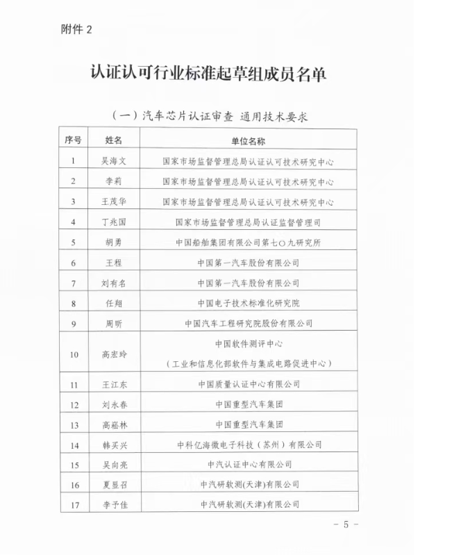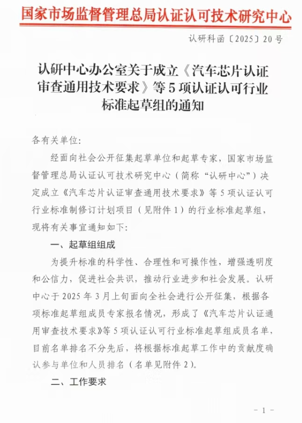认研中心办公室关于成立《汽车芯片认证审查通用技术要求》等5项认证认可行业标准起草组的通知